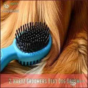 In tackling dog shedding problems, the Hartz Groomer’s Best Dog Brush stands out with its practical dual-sided design. This affordable grooming tool features stainless steel pins on one side that remove loose fur and tangles, while the nylon bristle/pin combo on the other distributes natural oils for a healthier coat.